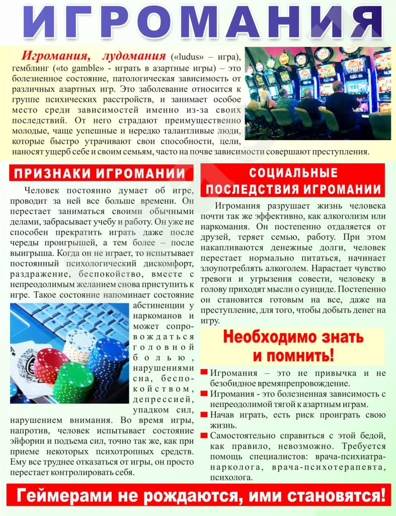 Игромания (игровая зависимость, лудомания, гэмблинг-зависимость) – разновидность психологической зависимости, заключается она в потребности в азартных играх, при этом утрачивается интерес к материальным, семейным, социальным ценностям. Наиболее распространенный вариант игромании – зависимость от компьютерных игр.