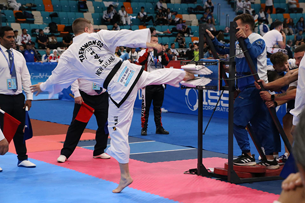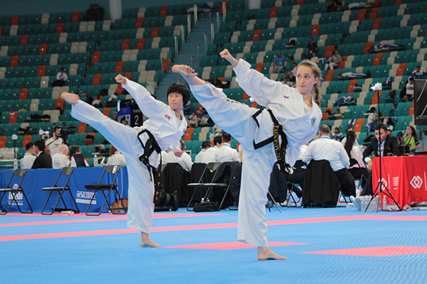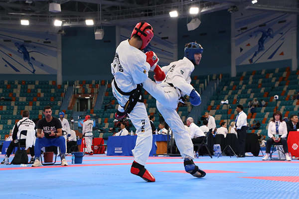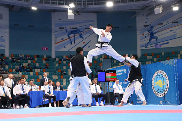 Поединок. Один из самых зрелищных видов соревнований по таэквондо. Бой состоит из двух раундов по две минуты с перерывом в одну минуту. Финальный поединок может состоять из трех раундов. Полный контакт запрещен. Четверо боковых судей каждый самостоятельно ведут подсчет очков. По результатам их оценок определяется победитель. За удар рукой в голову или в корпус начисляется одно очко. Удар рукой «на воздухе» в голову — два очка. За удар ногой в корпус — одно очко, а если удар выполнен «на воздухе» — два. Удар ногой в голову оценивается в два очка, а «на воздухе» — три. За соблюдением правил следит рефери, который работает в центре площадки. Запрещается наносить удары по затылку, спине, ниже пояса, не допускаются удары локтями, коленями, головой. За запрещенные действия спортсмен получает замечания или предупреждение. Три предупреждения означают дисквалификацию спортсмена. Три замечания ведут к потере одного очка. При ничейном результате проводится дополнительный раунд (1 мин), если и после него тоже ничья, то бой продолжается до первого технического действия. Все это требует от спортсменов выносливости. Для победы в соревнованиях необходимы эффективность технических действий и тактическая грамотность. Соревнования в разделе Матсоги проходят, как в личном так и в командном виде программы.